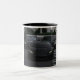 Uma caneca de cerâmica branca com jante preta. A design da caneca apresenta uma imagem monocromática de dois carros de luxo pretos em uma rua da cidade. O primeiro plano mostra a extremidade frontal de um Lamborghini, com seus faróis distintos claramente visíveis. Por trás do Lamborghini, uma BMW é parcialmente visível. O fundo inclui uma paisagem urbana turva, com elementos de prédios e possivelmente árvores. A imagem inteira é predominantemente sombra escura de cinzas e preta. A caneca é posicionada sobre uma superfície de cor clara, provavelmente mármore ou um material semelhante, com uma luz macia refletindo na sua superfície.