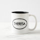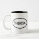 Verifique para fora esta caneca de Theresa! É seu nome Theresa? Ou você tem uma esposa, um namorada, um membro da família fêmea ou um amigo fêmea nomeados Theresa? Em caso afirmativo, esta "caneca do selo conhecido" é exatamente o presente que você está procurando! As características de design "Theresa" na rotulação preta grande cercada por dois ovals, um fino e um grosso.