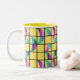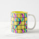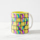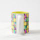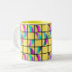 Esta caneca tem uma design moderna do século médio de luas em crescente dividida horizontalmente em três cores, rosa, azul, lavanda, ou marisca, dividida ao meio e espalhada em uma grade com fundo amarelo. Se você gosta do design, mas quer cores diferentes, me mande mensagem.