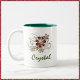 Caneca festiva com flores vermelhas e beges. Adicione o seu nome para personalizar em verde escuro, com letra de script.