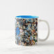 Mug com uma mistura colorida de vidro azul, verde, laranja e claro numa costa arenosa. Decoração divertida de mesa para uma casa de praia, para um amante de praia ou para lembrar de férias no oceano. Foto tirada na famosa Glass Beach, Fort Bragg, Califórnia.