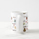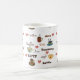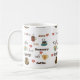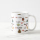 Uma caneca de café branco com a palavra "café" em línguas diferentes e em pias batismais e imagens de canecas e de corações de café. Isto faria um presente perfeito para todo o amante do café.