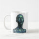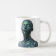 Futuristic green-toned metallic female android with closed eyes, centered on a white mug.