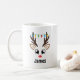 Um café de Natal ou uma caneca de cacau quente ilustra um rosto doce de rena com um nariz vermelho brilhante e luzes coloridas de cordas de bolbo de Natal penduradas nas suas galhadas. Personalize esta caneca de chocolate quente festiva com um nome próprio ou outro texto personalizado. Faz um presente de feriado divertido para qualquer garoto - crianças, netos, família e amigos!