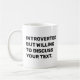 Destaque a sua personalidade com esta personalizável e engraçada Coffee Mug com a frase espirituosa "Apresentado mas disposto a discutir" seguida do seu próprio texto. Quer sejam livros, café, viagem, ou qualquer interesse peculiar, você pode escolher o tópico que o define. Você pode adicionar seu próprio nome para um toque pessoal. Esta caneca de café humorística faz um presente excelente para introvertidos com senso de humor. Use a ferramenta design para alterar a cor do texto, se desejar, e selecione o tamanho e o estilo da caneta no menu.