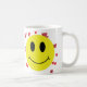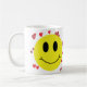 Um rosto amarelo feliz cercado por corações vermelhos destaca esta torcida caneca de café.