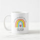 Mágula branca com arco-íris rosa, amarelo e azul com uma pequena flor vermelha em forma de coração com folhas verdes. Sobre o arco-íris em texto curvo preto lê-se, "Sprinkled With A Dash Of Rainbow Magic" abaixo da imagem está uma modelo para adicionar seu nome à personalização.