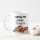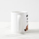 Uma caneca engraçada como um presente fofo para um amante de café/cachorro com ilustração do córrego-d'água e um roteiro personalizado com letra decorativa "esperando um café para chutar"