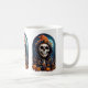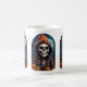 Uma caneca com uma ilustração de um esqueleto vestindo uma jaqueta encapuzada com um chapéu de bruxa laranja em cima. Cercado por abóboras giras e assustadoras. Uma lua brilhando nas costas com um morcego solteiro voando perto. Design de Halloween de outono divertido.