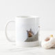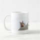 Vista frontal de um esquilo com uma noz na testa, olhando para você hetero. Um animal engraçado e curioso. O esquilo simboliza a praticidade, a necessidade de fazer provisões preliminares. Caneca de café. Você pode alterar ou excluir a imagem e o texto do modelo.