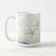 Um design de tema de praia com dois estrelas-do-mar em uma praia arenosa com o oceano ao seu redor.