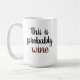 "Este é provavelmente vinho" exibido na fonte do script na frente de uma caneca de café branca. A palavra "vinho" tem uma cor de burgandy profunda. Excelente ideia de presente para o amante do café adicionar um pouco de humor à sua manhã.