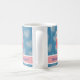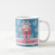 Esta caneca adorável é excelente para crianças, jovens e velhos, que adoram chocolate quente. Este design bonito apresenta um touro vestindo um suéter vermelho e botas. Os touros estão segurando uma caneca de chocolate quente com creme de chicote e doce de menta. O fundo é um azul claro com nuvens brancas, pufas e em forma de coração. Na parte inferior, a faixa diz "Eu amo chocolate quente". O texto pode ser personalizado.