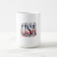Considere esta caneca de café americana única. Apresenta uma exibição decorativa de cores vermelha, branca e azul.