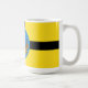 Mug com um design com a bandeira de Wellington City, Nova Zelândia. Bandeira amarela com cruz negra e selo da cidade com imagem de um navio no centro