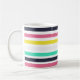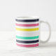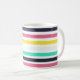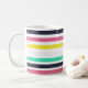 Uma lata colorida pode resfriar com um padrão listrado. A caneca branca tem listras horizontais pretas, cor-de-rosa, amarelas e turquesas. Ele foi projetado para ajustado de uma lata de bebida padrão.