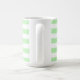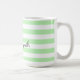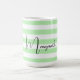 Esta caneca apresenta um padrão listrado em verde pastel e branco com um nome personalizável em letra preta.