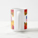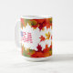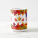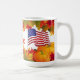 Um design de queda muito colorido com folhas e abóboras, e o banner do Star-Spangled voa orgulhosamente. As letras USA aparecem na parte de trás da caneca.