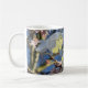 Esta maravilhosa caneca colorida mostra o meu design e Eurasiano Bluetit, alimentando dois pintinhos bebês contra um pano de fundo de amêndoa. Este pássaro é provavelmente o mais colorido da família Chickadee sendo uma adorável mistura de azul e amarelo. Esta caneca é perfeita para celebrar os feriados e Primavera ou um presente adorável para o Dia das Mães.