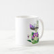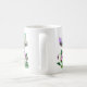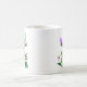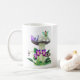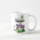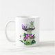 Mug com uma fada pequena com asas verdes sobre um cogumelo grande, visto, acompanhado por uma borboleta roxa. Abaixo, flores roxas vibrantes e folhas verdes exuberantes adicionam cor à cena química.