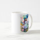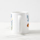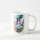 Uma caneca com duas jovens com asas de fada. Um está sentado sobre um cogumelo e o outro está em pé em um jardim vibrante cheio de flores coloridas e borboletas.