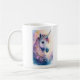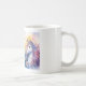 Mug com dois monocórnios majestosos em meio a um fundo sonhador de cores pastéis macios com um homem fluente adornado com flores delicadas, criando uma cena encantadora.