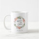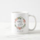 Um doce e elegante presente para a mãe do noivo, a caneca apresenta uma coroa aquosa de peônias cor-de-rosa-pêssego e folhagem botânica com a "mãe do noivo" inscrita no dentro em escrita manuscrita. Personalize com sua data de casamento embaixo. Projetado para combinar com a nossa coleção floral de MidSummer.