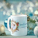 A roda de um navio náutico arma a fotografia em cada lado desta bela caneca de Natal costeira, com fundo aquoso. No centro está "Seas e Saudações na caligrafia moderna da escrita, e o nome da família com o ano.