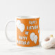 Uma caneca com um Parabéns e Balões num fundo laranja. Personalize o plano de fundo laranja entre outras opções.