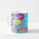 Uma caneca de novidade divertida para uma celebração de aniversário com balões e galerias coloridos de festas e Feliz Aniversário em texto vermelho. Mostrado aqui por 1,5 km de aniversário de 50 anos e texto engraçado "Parabéns Sua Garota Grande Agora!" mas eles podem ser mudados para se adequarem a qualquer idade para adultos ou crianças com o texto engraçado limpo ou mudado como você gosta sem custo extra. Lembre-se de personalizá-lo com o nome pessoal dos destinatários para esse toque especial extra.