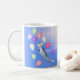 Uma caneca de café com minha obra de arte original de um golfinho feliz cercado por balões e vestindo um chapéu de festa. Texto personalizável diz "Parabéns!"