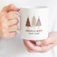 Design de caneca festiva sazonal apresenta uma elegante exibição de árvores de Natal nevadas em vermelho, dourado e rosa sobre fundo transparente. Abaixo das árvores, a seção "Casado & Feliz" é apresentada em elegante tipografia clássica. Adicione os primeiros nomes do casal ou a linha de texto personalizado em um script vermelho correspondente ao modelo simples de usar. Envie uma mensagem ou envie um e-mail para beachpausedesigns@gmail.com para mais personalizações.