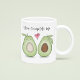 Esta design apresenta dois abacates bonitinhos e uma diversão engraçada e engraçada namorados feliz, com um moderno desenho animado de humor caprichoso, uma bebida de café de namorados, para o casal de marido esposa, estilo minimalista simples, de humor humorístico de marido mulher adorável, como você me completa dizendo, xícara engraçada, um gráfico de comida de abacate, namorados para ela