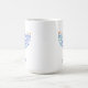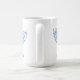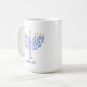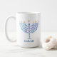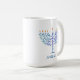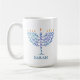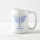Esta design menorah apresenta tons de azul, oferecendo um toque delicado. Personalize sua caneca de Chanucá com um nome personalizado; ela foi projetada para fácil edição. Além disso, é máquina de lavar louça e micro-ondas segura.