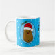 Adorável e engraçado batata marrom feliz vestindo um chapéu de Papai Noel vermelho e branco. A batata está em um estilo de arte cartoon e castanho colorido, tem braços e dedos colados e um sorriso grande e feliz com pontos para os olhos. O chapéu de Papai Noel em sua cabeça é vermelho, com um verme branco e uma pompom branca pendurados. Ele tem dentro a forma oval azul claro com uma estrutura azul escura e duas folhas ocas verdes com duas bagas vermelhas no topo do oval. A cor de fundo é um azul claro, com flocos de neve brancos flutuando prestes a dar uma sensação festiva a esta linda caneca sazonal. No centro da caneca estão modelos de texto para deixar como estão ou substituir o texto por sua própria mensagem. Também uma caixa de texto para adicionar seu nome. Se você quiser deixar o vazio, simplesmente exclua as palavras em cada caixa de texto.