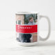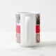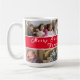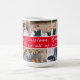 Design oferece espaço para seis fotos na frente, com um fundo padronizado de bonés, meias de Natal e canetas doces. A frente central exibe o texto em branco cursivo contra um suporte retangular vermelho. Um presente perfeito de "de todos nós".