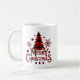Deixe esta caneca clarear suas festas com a sua linda árvore vermelha e pálida de búfalo preta e a saudação de "Feliz Natal" com detalhes do floco de neve.