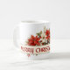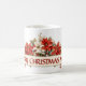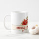 Feliz Mãe de Natal. Uma fita de cor creme com o texto: Mãe de Natal feliz com decoração de cor d'água de Poinsettias brancas e vermelhas, groselhas e folhagem. Opcional para Personalizar o texto. Este é um presente de Natal perfeito com floral de inverno eterno que ela pode usar ano após ano. Dê a sua mãe uma caneca favorita para o Natal.