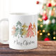Uma caneca de Natal simples e elegante para si próprio ou para embalagem de um presente de Natal com um abstrato de pinheiros a aquarelas, verdes, vermelhos, dourados e laranja, e "Feliz Natal" num guião de na moda.