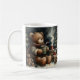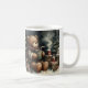Ursos peludos adoráveis sentados em frente a uma árvore de Natal vestidos de suéteres, o urso maior está segurando uma caneca enquanto se senta ao lado de uma pilha de presentes com uma fumaça de velas. Um belo roteiro no meio que diz Natal.