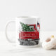 Esta caneca de café para as empresas apresenta um caminhão vermelho vintage carregando uma árvore de Natal na parte de trás com um nome para personalizar na parte de trás do caminhão. Também personalize com um nome no centro. Projetado pelo famoso artista mundial Tim Coffey.