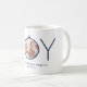 Celebre as simples alegrias da temporada com esta caneca de fotos personalizada, azul e branca, marinho. Texto e imagem são fáceis de personalizar. (DICA DE IMAGEM: Uma maneira de centralizar uma foto exatamente como você deseja é recortá-la antes de carregá-la no site do Zazzle.) Design apresenta um ornamento moderno minimalista de JOY, nome e ano da família de tipografia quic e uma imagem de sua escolha. Faz uma ideia elegante de presente de Natal para ela ou para ele.