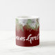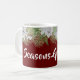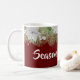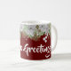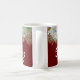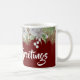 design de caneca de excelente de apresenta belas terras de borda superior de poinsettias brancas de cor d'água e outras folhagens sazonais em fundo vermelho de amora-de-amora com texto personalizável branco.