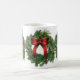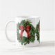 Destaque a decoração ou a sua casa com esta coroa de Natal clássica, desenhada por uma caneca de café cerâmica. Esta caneca apresenta uma foto recortada de uma coroa verde "real" e um arco vermelho. Comprar esta caneca para você ou como presente para aquela pessoa especial.