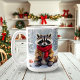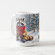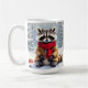 Uma xícara de café de Natal super fofa que tem uma ilustração do estilo aquarela ai de um guaxinim festivo sentado numa floresta de neve branca durante um dia de inverno com um pano de fundo de pinheiros decorados em férias.