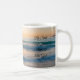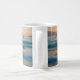Uma caneca de café com o nascer do sol sobre o oceano e "Fique quieto e saiba que sou Deus" escrita nela. IA gerada.