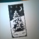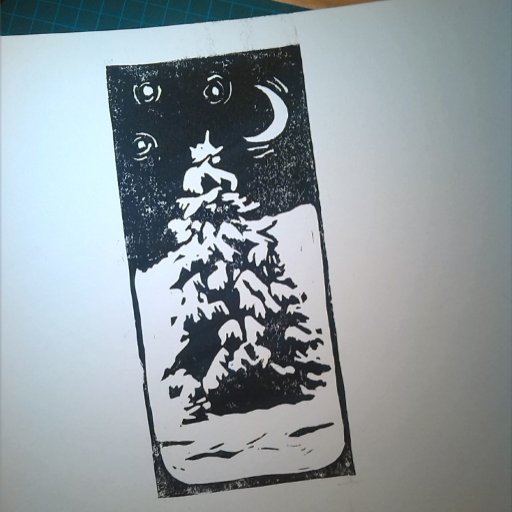 Impressão de lino preto e branco de uma pacífica cena de inverno: uma árvore de abeto solitário em pé em uma paisagem nevada à noite, com um céu estrelado acima.