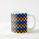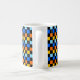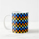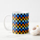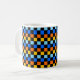 A vibrant checkerboard pattern featuring alternating rows of orange, yellow, light blue, and blue squares against a black background. The design is bold and energetic.