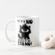 A funny, sarcastic black-and-white graphic design showcases a black cat with frazzled fur and a scowling expression. The black handwritten text says, "First of all, no. Second of all, still no!" Available on a wide variety of products, this design makes a perfect gift for cat lovers.