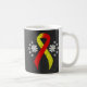 Fitas vermelhas e amarelas com flores brancas em um design de quadro. A fita vermelha e amarela está associada à Sensibilização para a Hepatite C em maio e à Sensibilização para a Co-Infecção por VIH/VHC em dezembro.